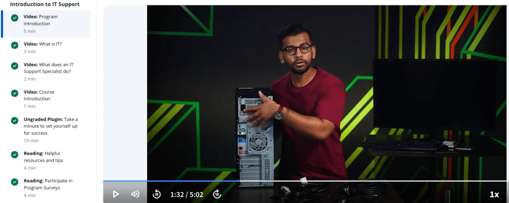 I recently completed the Technical Support Fundamentals course in the Google Professional IT Support Certificate on Coursera and it’s not surprisingly one of the easier courses in this five course program. It generally gives you a bite sized preview of content from the other courses: basic computer terminology (PC components), networking, operating systems, security, and some basic soft skills around customer interaction. One of the most enjoyable activities was the walkthrough of how to physically build a PC and learning basic binary.